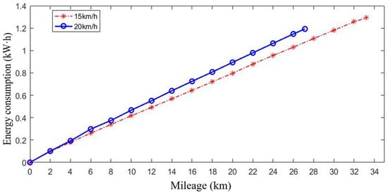 In Figure 4, the energy consumption of the test vehicle exhibits a linear correlation with mileage during average speed driving. The energy consumption rates of the test vehicle are 0.039 kW·h/km at 15 km/h and 0.0439 kW·h/km at 20 km/h. Notably, the average energy consumption rate of most commercially available electric vehicles stands at 0.133 kW·h/km [20], indicating a substantial disparity between experimental and market data. This variance primarily stems from the higher motor power of commercial vehicles compared to the test vehicle, as well as the standard NEDC cycle testing conditions that involve frequent acceleration, high-speed driving, and energy-consuming factors such as air conditioner usage.