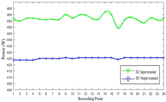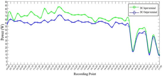 Illustrated in Figure 7, the DC–DC converter efficiency varies significantly within the range of 75% to 98%, but remains relatively stable between 85% and 92%. Throughout the measurements, the average power loss of the DC–DC converter amounts to approximately 12.4%. The average input power of the DC–DC converter is approximately 62.9 W, while the average output power reaches around 55.1 W. Consequently, the total output power of the solar panel DC–DC converter during the test period is 0.418 kWh.