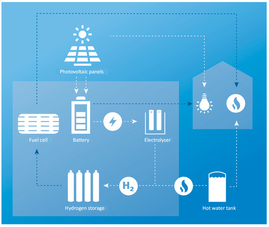 - Hollemuller, P.; Joubert, J.-M.; Lachal, B.; Yvon, K. Evaluation of a 5 kWp photovoltaic hydrogen production and storage installation for a residential home in Switzerland. Int. J. Hydrogen Energy 2000, 25, 97–109. [Google Scholar] [CrossRef]