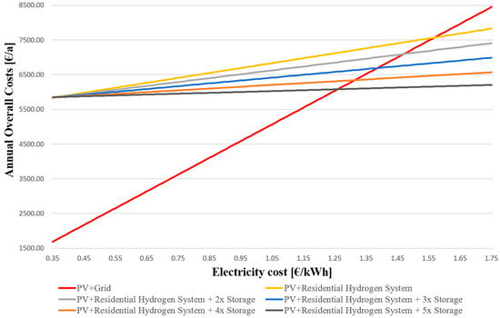 Table 10 shows, based on the simplified calculation, that the annual cost of a hydrogen storage system is more than 4.5 and almost 6 times higher than the cost of using a battery system or drawing electricity from the public power grid. The calculation shows that the annual electricity costs can be reduced to a minimum with the residential hydrogen system, but the high CapEx has a strong impact on the total cost. Therefore, in a scenario with very high electricity costs, the economic assessment of a residential hydrogen system may become more favourable. The calculation of different electricity price scenarios, shown in Figure 2, indicates that electricity prices as high as 1.57 EUR per kWh would be required to make the residential hydrogen system economically viable compared to the baseline scenario. Compared to Scenario A, including the 20 kWh battery, even much higher electricity prices are needed to make the residential hydrogen system economically viable.