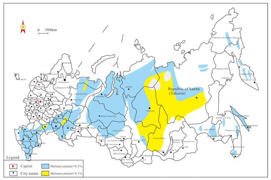 According to Akutsent’s research in 2014, it was found that the helium resources discovered in Russia are mainly distributed in natural gas fields on the West Siberian Plateau. In addition, there are also some helium-rich natural gas fields in the Orenburg field in the Northern Caspian region, the Chayanda gas field in the Yakutia region, and some areas in the Irkutsk region and Komi Republic (Figure 2) [17]. From the distribution maps of the helium contents in the United States and Russia, uneven distributions also occur within these countries.