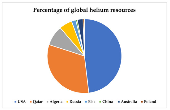 In 2016, the global helium demand was 2.3 × 108 m3, but the annual production was only 1.54 × 108 m3. According to the United States Geological Survey, the global helium resource amount was approximately 520 × 108 m3 in 2020, of which the United States accounts for about 206 × 108 m3, followed by Qatar with a helium resource reserve of about 10 × 108 m, while China’s helium resource amount is about 11 × 108 m3, accounting for only 2% [13].