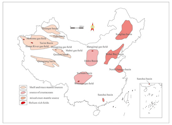 Cao, Z.X. (2001), Guo, N.F. (1999), Dai, J.X. (2003), Yu, Q.X. (2013), and Zhang, X.B. (2020) [12,22,23,24,25,26,27,28] collected natural gas samples from the Hankou Gas Field and the Huangqiao Gas Field on the Tan-Lu Fault, the Wanjinta Gas Field in the Songliao Basin, the Weiyuan Gas Field in the Upper Yangtze Plate, the Yakra Gas Field and the Hetianhe Gas Field in the Tarim Plate, and the Mabei, Dongping, and Niudong areas in the Qaidam Block, respectively, and analyzed their natural gas components using mass spectrometry. We reprocessed the test result data (Table 1). We found that helium gas is produced along with natural gas in gas reservoirs. Helium-rich gas reservoirs with a crustal origin are mainly composed of organic (CH4) gas reservoirs. Helium-rich gas reservoirs with a mantle origin are characterized by a high content of nitrogen gas. The helium-rich natural gas can be classified into organic helium-rich gas reservoirs and inorganic helium-rich gas reservoirs based on its geochemical composition. From a geological structural perspective, the mantle-origin helium-rich gas reservoirs are mainly distributed in fault zones, where there is no supply of hydrocarbon source rocks for the reservoirs, but the tectonic activity is strong and the faults are well developed. The helium gas reservoirs with a crustal origin are generally associated with natural gas and are distributed along the edges of tectonic plates.