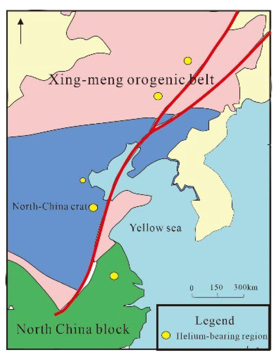 The development of fault structures plays a dual controlling role in the formation of helium deposits. On the one hand, it can serve as a pathway for the upward migration of crustal-sourced helium, and on the other hand, it can serve as a pathway for the input of mantle-sourced helium [36]. The process of helium transferring from mineral particles that undergo decay to pore water is the first stage of helium transport. Then, the helium in the pore water is fractionated and extracted by the migrating gas, which contains helium gas or helium groundwater. This migrates through fractures, faults, and undergoes secondary transport until it accumulates in a structural trap, forming a helium reservoir in the geological stratum. In the crust-mantle mixed-type helium-bearing basins in eastern China, there is a strong correlation between helium gas and the Tan-Lu fault zone [37]. Research has found that areas where helium accumulates are near the Tan-Lu fault zone. According to survey data (Table 2), high helium samples from the Songliao Basin, Bohai Bay Basin, and northern Jiangsu Basin are distributed on both sides of the Tan-Lu fault zone (Figure 6), exhibiting a strong correlation. The Tan-Lu fault zone is a crustal fault that cuts through at a thickness of 30–40 km.
