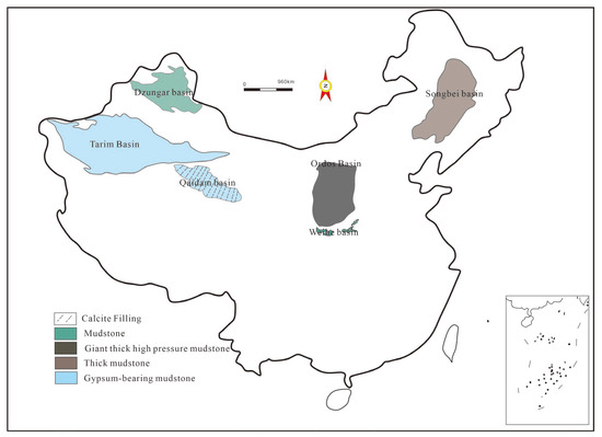 Helium gas molecules are the smallest known chemical substance in nature, so their storage requires even stricter cap rock conditions. Helium-rich gas reservoirs are usually capped by tight anhydrite, salt rock, and shale formations [40]. Based on the distribution of helium source rocks and the lithology of cap rocks, we conducted directional and qualitative searches for cap rocks in Chinese gas reservoirs, and drew up a map showing the types and distribution of cap rocks (Figure 7).