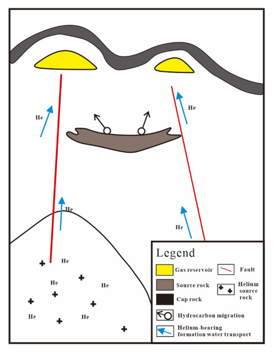 Water-carried gas is the main transport pathway in the central and western regions, mainly distributed in the Sichuan Basin, the Qaidam Basin, and the Tarim Basin. Helium source rocks provide the source for helium gas generation, and the development of structural faults provides the pathway for helium gas to migrate upwards. However, the movement of helium in pore water is very slow [38,39]. Moreover, helium cannot form a separate gas stream and cannot enter a trap driven by buoyancy alone. Therefore, the large-scale migration of helium relies on groundwater and gas-bearing layers as carriers. As mentioned earlier, helium gas often accompanies the enrichment of natural gas. An analysis of the gas composition in Table 2 shows that the primary transport pathway for helium in Central and Western China is through the migration of helium in natural gas, mainly distributed in the Sichuan Basin, Qaidam Basin, and Tarim Basin.