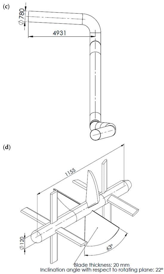 Pictorial view: (a) top view and (b) side view, with an opening to show the installed turbine; (c) front view and (d) isometric view of the turbine with basic dimensions.