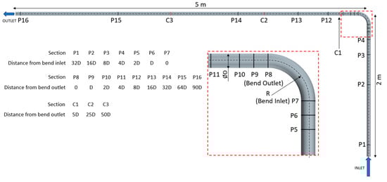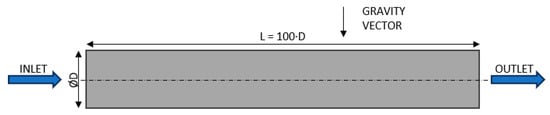 The flow of the liquid phase with the solid phase in the pipeline under consideration was analyzed numerically. The first part of this section presents experimental verification of the numerical model based on the flow through a straight pipe [30] and through a pipe with a 90° knee [17,24]. The numerical model verification started with the flow through a straight pipe [17,30]. The pipe length was 100·D, as shown in Figure 3. The diameter D = 0.130 m.