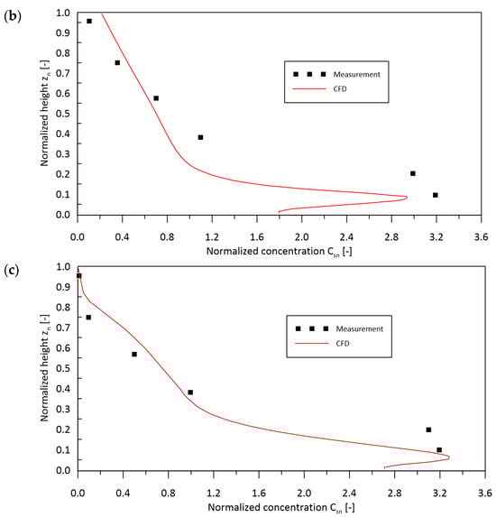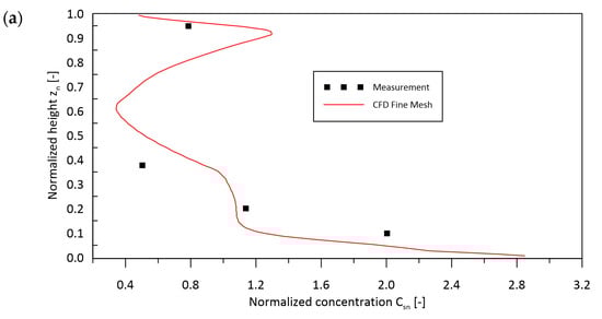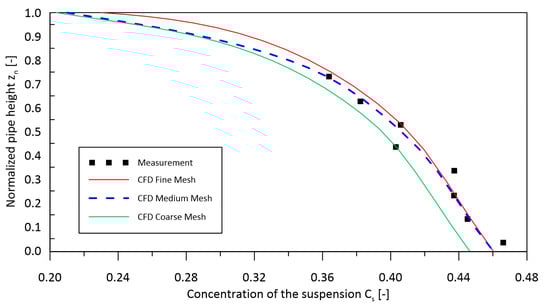 After the simulations, the first to be presented was the correlation of the suspension content Cs at a given relative height zn. The relative height was defined as the quotient of the vertical coordinate and the pipe diameter zn = z/D, where 0 means the pipe bottom and 1 is the pipe top. The distribution was measured at length L = 100·D from the inlet. The chart presents the results for three meshes compared to experimental data [30].