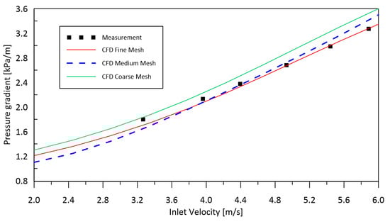 The next chart in Figure 6 presents the pressure gradient defined as Δp/L depending on the inlet velocity v. The pressure drop was calculated as the difference in total pressures between the pipe inlet and outlet.