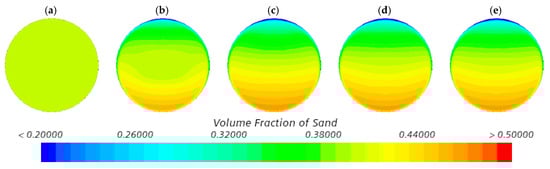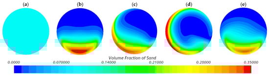 Then, on a few selected sections, the sand volume fraction was presented graphically (cf. Figure 7). The sections were created, respectively, for 0.0, 0.25, 0.5, 0.75 and 1.0 of the pipe relative length x/L, where x was the length coordinate.