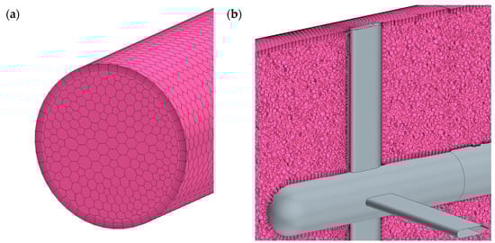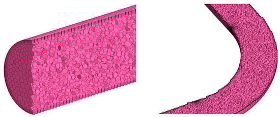 The geometry was then discretized using a polyhedral mesh (cf. Figure 14). The same settings were applied as for the MEDIUM-type mesh in the straight pipe. Additionally, the mesh was made denser in the area of the blades, as this is where key flow phenomena, such as layer separation, secondary vortices and large velocity gradients occur. These phenomena have an impact on the momentum transfer from the fluid to the rotor, and simulating them correctly is crucial for the analysis accuracy.
