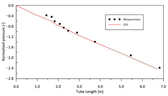 The next verification was prepared for the pressure drop. In this case, the pressure drop was determined based on measuring points P1–16 presented in Figure 9. The chart presents the normalized pressure drop Δpn = Δp/(ρv2/2) as a function of the distance from point P1. Pressure at point P1 was adopted as the reference pressure. The correlation is presented in the figure below.