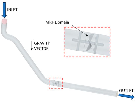 This section presents simulations of a pipeline with a turbine using the single- and the two-phase approach. The main goal here was to make a quantitative comparison of the pressure drop, efficiency and power for a pipeline with pure water and with a mixture of water with sand. In each approach, the inlet velocity and a boundary condition of the pressure outlet type were assumed. The velocities were selected to establish a point at which the turbine efficiency began to be higher than zero, and then find the maximum point to see how high efficiency would be when this maximum point were crossed. The single-phase simulation was performed without taking account the gravity equation as it has no impact on the solution of the system of equations. The so-called multiple reference frame approach was adopted into the rotational domain, with the rotational speed adopted at 60 rpm (the rotational speed adopted while selecting the angle of incidence of the blades). The accuracy of the proposed method was previously tested using Laser Doppler Anemometry [22]. For the multiphase analysis, the inlet volume contents of water and of the solid phase were assumed with their respective values defined as 0.487 and 0.513. The grain average size in the suspension was adopted as 5 × 10−4 m. The water and the solid phase density were assumed as 998 kg/m3 and 2660 kg/m3, respectively. In addition to sand, the solid phase also included copper ore fractions. Figure 13 presents a visualization of the boundary conditions in the pipeline under analysis.