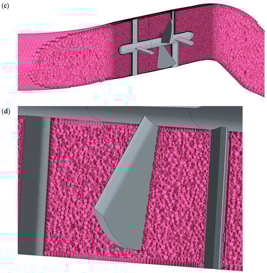 Pipeline and turbine discretization using a polyhedral mesh: (a) pipeline inlet, (b) denser mesh in the area of the shaft casing inlet part, and (c) denser mesh in the turbine area; (d) view of the rotor blade.
