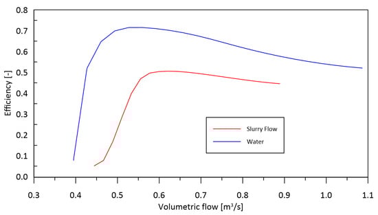 Using Equation (23), a chart was made showing the turbine efficiency based on the quantitative data gathered after the simulations performed for both cases, i.e., the single- and the two-phase approach (cf. Figure 15). The chart indicates that the efficiency for the flow with the suspension was more than 20% lower for the turbine maximum working point compared to the single-phase flow. The optimal output for the designed turbine in the slurry flow was about 0.6 m3/s. Moreover, the point of maximum efficiency was shifted toward a higher volume output, and the characteristic curve of the useful operating range was much narrower.