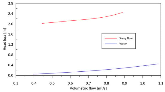 Next, calculations were made of the pressure drops measured from the inlet to the outlet in the pipeline. The results are presented in the form of the height of the liquid column in Figure 16 according to Equation (25), where the densities of the water and of the suspension were adopted as 998.2 and 1850.6 kg/m3, respectively. These drops are necessary to calculate the power that the turbine is able to generate depending on the volume output, taking account of flow-related pressure losses. As indicated by the chart, the pressure drops for the slurry flow are by more than 1.2 m bigger compared to the flow of pure water. For the optimal point, the pressure drop totalled 1.42 m for the slurry flow.