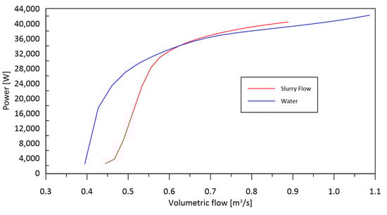 Formula (26) was then used to calculate mechanical power that the turbine is able to generate depending on the output, efficiency and flow-related losses. The power is presented in Figure 17. For the optimal efficiency in the slurry flow, power totaled 36,590 W, whereas for the same output for pure water it is 37,878 W. Despite the lower efficiency for the slurry flow and higher flow losses, power is compensated for owing to the almost twice higher density of the medium.