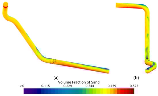 Visualization of the suspension concentration in the pipeline: (a) side view; (b) front view.