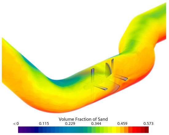 The next step was to present a 3D visualization of the suspension concentration in the entire pipeline (cf. Figure 18) for the optimal working point, i.e., for the output of 0.6 m3/s. The distribution illustrates how the liquid phase and the solid phase behave depending on the pipeline inclination angle, the bends on the flow path and the rotor (cf. Figure 19). The solid phase separation can be seen on the bends upstream of the turbine. By its rotation, the turbine pushes the suspension into the upper part of the pipe. Due to the gravitational force, sand sedimentation re-occurs in the pipe lower part.