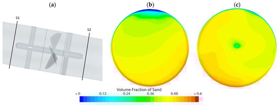 Distribution of the suspension in sections S1 and S2: (a) visualization of the sections, (b) section S1, and (c) section S2.