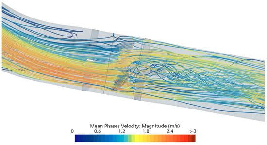 Figure 21 below presents a three-dimensional visualization of the velocity field using streamlines. The velocity is defined by Equation (27) and presents the weighted average for the solid and the liquid phase, where the weights are volume fractions of the phases.