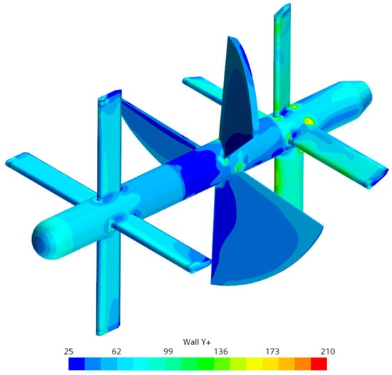Figure 22 shows the distribution of the y+ parameter on the surfaces that compose the turbine’s construction. The graph is shown for pure water flow through the pipeline for a flow rate of 0.6 m3/s. Classically, this value should oscillate around y+ = 1. However, achieving such a low value would involve a very large number of elements in the wall layer, which would increase the size of the computational grid considerably. In addition, the All+ Wall Treatment in the turbulence model in all simulations was used [31]. This means that the values presented in Figure 22 were acceptable values for this turbulence model.