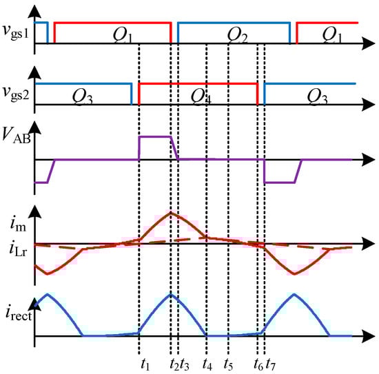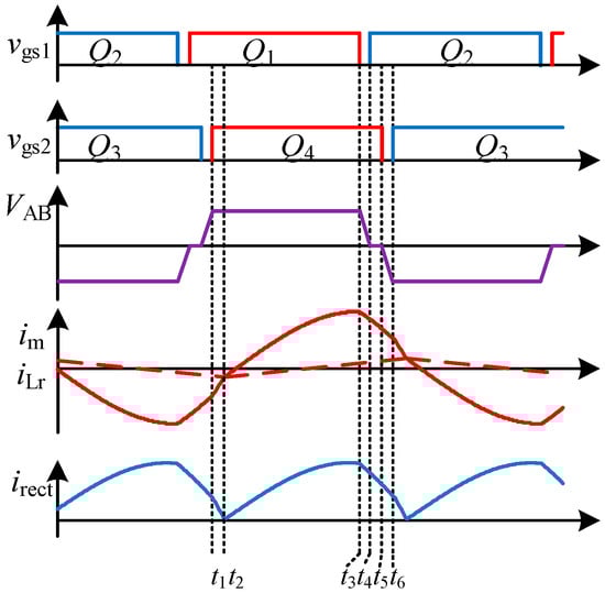 Q1–Q4 are all turned on with a 50% duty cycle, and Q1 is complementary to Q2, while Q3 is complementary to Q4. By adjusting the switching frequency, the impedance of the resonant tank is changed, and the output is regulated by PFM. By shifting the switching angle θ between Q1 and Q4, VAB is adjusted to a three-level square wave with a different proportion of zero-voltage level, and then output is regulated by PSM. When θ = 0°, VAB is a two-level square wave without a zero-voltage level; when θ = 180°, VAB equals 0, and the output voltage can be regulated to 0, theoretically.