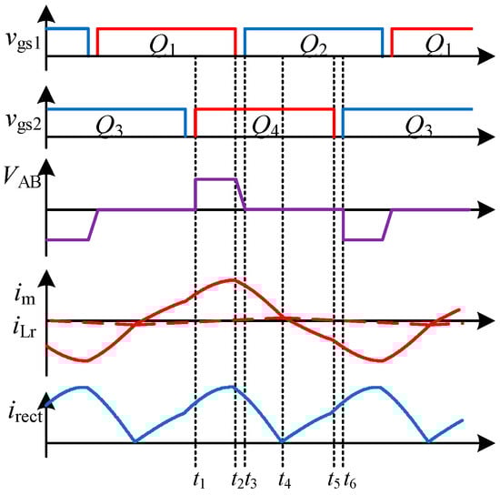 Type 4 represents the situation which falls between type 3 and type 4. It can be divided into six working modes at a positive half cycle, as Figure 7 shows, when including the dead time. Mode 4 [t4–t5] is equal to mode 4 in type 2, and mode 5 [t5–t6] is equal to mode 5 in type 3. Thus, it can be inferred that the ZVS performance of Q3 is hard to achieve, and the ZCS performance of the rectifier diodes is lost.