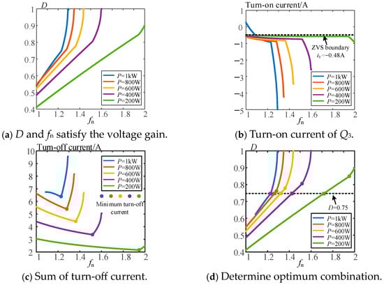 Figure 10a shows different fn and duty-cycle-D combinations at Vo = 300 V under different loads, and it can be concluded that there are innumerable combinations at a certain voltage gain and load. Figure 10b shows the turn-on current of Q3 in the lagging bridge under different the combinations shown in Figure 10a. The minimum current for ZVS performance can be inferred from (11).