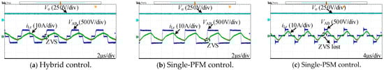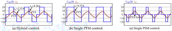 Table 6 shows the simulation results under Vo = 300 V, P = 1 kW. Due to Vo = 300, the adaptive D changes to 0.79, according to (12). The conclusion is that when applying the hybrid control, ZVS performance is achieve, while it is lost under single PSM, and the sum of the turn-off current is 5.53 A. For single PFM, though ZVS performance is achieved, the sum of the turn-off current is 9.36 A, which is 1.69 times that of 5.53 A, and the peak value and RMS value of iLr in the hybrid control are almost the same as the single PFM. Due to the reduced turn-off current and fs, the turn-off loss is reduced by about 43.5%.