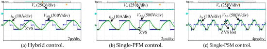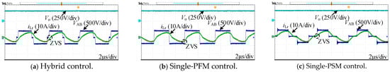 Figure 12 shows the VAB and iLr waveforms when applying three control strategies under Vo = 200 V and P = 1 kW. For hybrid control, it can be seen that the ZVS performance is achieved; the turn-off current is 2.32A (lagging bridge) and 8.38A (leading bridge), and the sum is 10.7 A. For the single-PFM control method, although ZVS performance is achieved, the sum of the turn-off current is 16.54 A, which is 1.55 times that of 10.7 A. For single PSM, the ZVS performance of the lagging bridge is lost, due to a large phase-shifting angle. Table 4 presents all the comparative data: it can be seen the peak value and RMS value of iLr under hybrid control are almost same as the single PFM. Due to the reduced turn-off current and fs, the turn-off loss is reduced by about 39.7%.