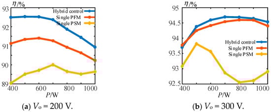 In this section, a 1-kW/Vo = 200–500 V experimental prototype is built to validate the theoretical analysis and feasibility of the hybrid control method. The experimental platform is shown in Figure 13, and the parameter of the converter is shown as Table 3. Three groups of experiments are developed including Vo = 200 V (P = 1 kW/500 W), and Vo = 300 V (P = 1 kW) under the hybrid control method, single PFM and single PSM. To ensure ZVS performance, the adaptive duty cycle D of the hybrid control maintains a margin of about 10% with respect to the theoretical-analysis results.