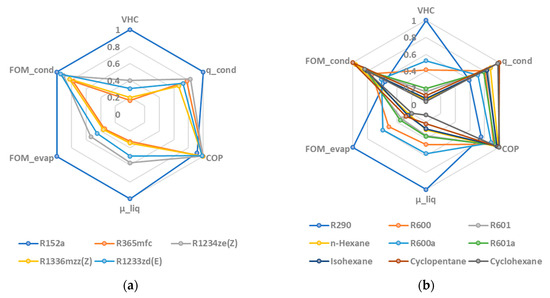 A comparative analysis was conducted by identifying significant thermodynamic variables to highlight the fitting of the tested fluids for HTHPs, as detailed in Table 4. These variables cover the most interesting and fundamental aspects for a basic analysis of optimal fluids for high-temperature heat pumps: overall performance, parameters of interest for the compressor, parameters relevant to heat exchangers, and safety considerations. The identified variables were used for the definition of a proper figure of merits, i.e., a portion of extended equations that can clearly compare the specific performance of the system under analysis (in this case, the thermodynamic cycle of a HTHP) with another. The figures of merit were extracted from Palm, 2008 [35], and were subsequently applied across all configurations assessed.