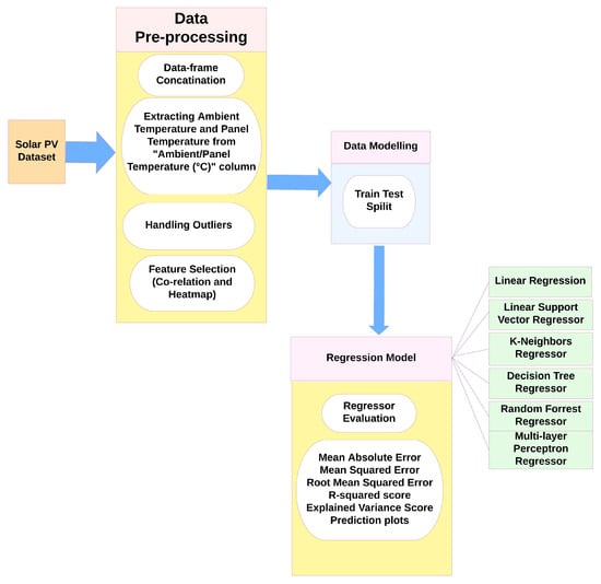 The various building blocks of the proposed model are presented in Figure 2. It starts with taking the PV dataset as the input and performs multiple preprocessing steps on it. The preprocessed data frame is directed for data modeling and to the selected regressor at the end.