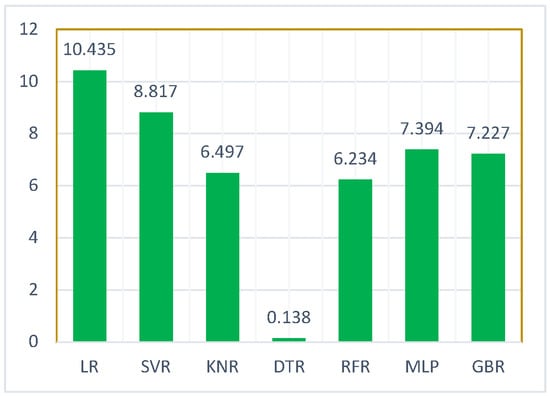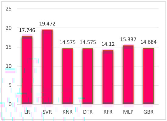 Similarly, Figure 17 depicts the RMSE scores obtained using various regression methods. The vertical axis represents the numeric values ranging from 0 to 30, and the values of RMSE obtained using each regressor model are presented in the plot.