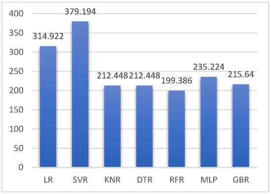 Similarly, Figure 6 depicts the RMSE scores obtained from various regression methods. The vertical axis represents the numeric values ranging from 0 to 700, and the values of RMSE obtained using each regressor model are presented in the plot.