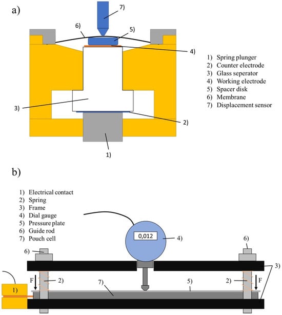 In Figure 3b, a common test stand for measuring the complete thickness change of battery cells is shown. Most of these setups consist of frames above and below the battery cell (3) held together by parallel screws (6). The battery cell (7) is typically placed on the bottom frame (3). A pressure plate (5) is placed on top of the cell to create a constant pressure over the entire surface. The swelling over the complete surface of the battery cell is measured. The screws also constrain the springs (2), which exert force on the pressure plate. The dial gauge (4) is located in the middle of the top frame. The electrical contact (1) is directly connected to a battery cell testing device [95]. Apparatuses similar to that in Figure 3b were also used to investigate expansion in pouch cells in several references [12,13,60,64,95,100,101,102,103,104,105,106,107]. Some apparatuses exclude the springs (2) and pressure plate (5). In such cases, the expansion of a single point of an uncompressed battery cell is measured [108,109].
