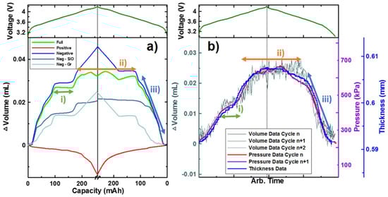 Calculated volume change of each electrode at charge and discharge cycle (a). Results of measured volume, pressure, and thickness change for NCA/SiG cell (b); Reproduced under Creative Commons License without any changes (CC BY 4.0 by Louli et al. [111]).