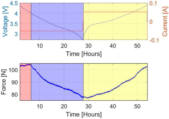 Dilatometry measurements can also be used to assess the force exerted by the cell expansion rather than measuring the expansion itself. Berckmans et al. [112] investigated the influence of external pressure on battery cells by measuring the force exerted by the cell undergoing expansion. Two different chemistry types where evaluated. The first cell was constructed with an NMC532 cathode, and the second with an NMC622 cathode. Both cells used an anode made of a silicon–graphite alloy. The measurement apparatus used was similar to that demonstrated in Figure 3b; however, the dial gauge was replaced with a force sensor between the top mounted plate, and a pressure plate was placed on top of the battery cell. Figure 5 shows the voltage and current in the top graph from the OCV test, whereas the lower graph shows the exerted force. The measurements demonstrated that the force curve could be divided into three main stages. The first stage (colored red in Figure 5) shows nearly constant force. This could be explained by the quantity of graphite in the anode alloy, which experiences less volume expansion than silicon during intercalation [113]. Delithiation in graphite occurs at potentials of 0.1– vs. Li/Li+, whereas in silicon, lithium deintercalates at potentials of 0.3– vs. Li/Li+ [42,114,115,116]. Berckmans et al. [112] also demonstrated that there was no C-rate dependency on the induced force due to intercalation.