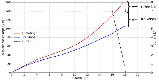 Measuring the changes in cell thickness can be a useful strategy for detecting lithium plating [85]. According to the literature, when transitioning from a completely unlithiated condition to lithiated LiC6 (intercalation of lithium), the total volume of the graphite anodes can increase by up to 10% [13]. When the lithium deposits on the surface of the graphite instead of intercalating into the anode, this leads to an additional increase in the overall volume. Some metallic lithium can intercalate as lithium ions into the anode host lattice after a certain relaxation time, thus leading to a reversible lithium plating with a capacity recovery [86,87]. Due to the reversibility of lithium plating, the cell thickness increases rapidly during the lithium plating condition and decreases during the rest time. Identifying lithium plating through volume expansion is straightforward, but it requires the use of an accurate device to measure cell thickness. Furthermore, this approach is only applicable to pouch cells [84]. Active lithium is lost either through SEI formation reactions or through the loss of contact to the active surface through the formation of isolated lithium metal particles or layers. This irreversible share of the lithium plating, as well as the gas generation, results in a permanent thickness increase [13].