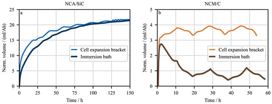 Comparison between 1D dilatation measuring of gas production through pressure plate and immersion bath. Normalized volume for NCA/SiC cells (a). Normalized volume for NMC/G cells (b); reproduced under Creative Commons License without any changes (CC BY 4.0 by Stock et al. [12]).