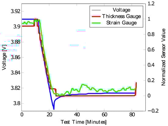 Response of the cell voltage, the cell expansion (1D dilatometer or thickness gauge ), and the strain of the cell surface (strain gauge) to a 0.5 C discharge pulse of a prismatic cell; reproduced under Creative Commons License without any changes (CC BY 4.0 by Popp et al. [15] with Data from [129]).