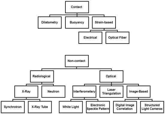 Michael et al. review the use of dilatometry in the measurement of electrochemical devices with a focus on push-piston style dilatometers [16]. The electrochemical devices considered include lithium-ion battery components such as graphite and silicon anodes, as well as cathodes of various compositions. This review provides an excellent overview of the use of dilatometry for the measurement of single components; however, it largely does not consider assembled batteries. This review also takes little consideration into contactless measurement approaches.