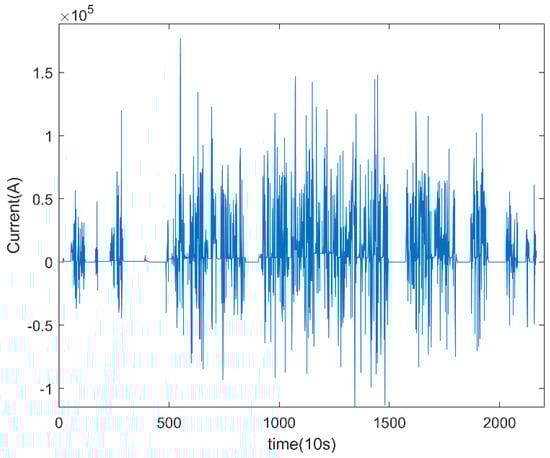 The battery module consists of 96 NCM811 Li-ion ternary batteries (LiNi0.8Co0.1Mn0.1O2). These cells are connected in series, and each cell operates in a voltage range of 3.5 V to 4.3 V. Since each module is connected in series, the current data flowing through each cell remain constant. The current data fluctuate greatly under the discharge condition, as shown in Figure 2, and it is difficult to determine the fault state of the battery through the current data. Regarding the temperature inside the battery module, due to a limited number of temperature probes, it can only be measured at 24 positions evenly distributed inside the module. As a result, it is not possible to measure the temperature of each battery cell which, together with the hysteresis of temperature parameters compared to electrical signals, makes the localization of early failures using temperature difficult to achieve at this stage.