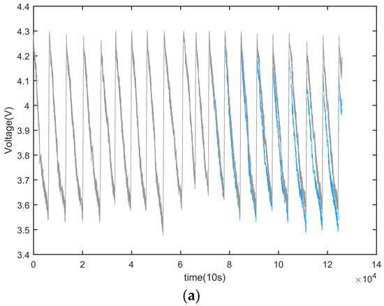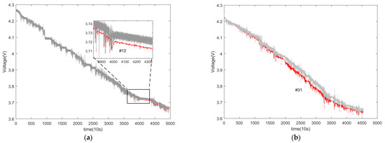 To verify the effectiveness of the proposed method discussed in this paper, historical data from the onboard power battery of an electric vehicle currently in use were employed for testing purposes. The aforementioned data were obtained from the most recent discharge cycle preceding the sampling cutoff. The sampling interval is 10 s, and the voltage resolution is 1 mV. Figure 9 contains the battery voltage data of two electric vehicles within the occurrence of a failure cycle, which were derived from a cloud-based big data platform.