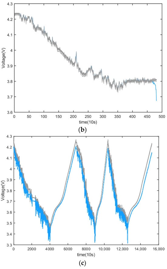 When an internal short circuit occurs in a battery, the resistance value of the equivalent resistance decreases; as a result, the voltage at the end of the battery will drop. As shown in Figure 3a, when a micro-short circuit occurs in a battery, the voltage drop is not obvious and is difficult to observe directly, while when the battery has a serious internal short circuit, as shown in Figure 3b, its resistance value is lower, the voltage drops quickly, and the change in the voltage curve is more obvious. Therefore, distinguishing a battery’s micro-short circuit is more difficult compared to a serious internal short circuit. In the case of a severe internal short circuit, the impact is immediate and significant. Therefore, it is crucial to identify the faulty battery unit promptly to prevent any potential failure. It is more practical and effective to predict a fault before it occurs, rather than conducting a diagnosis after experiencing a failure.