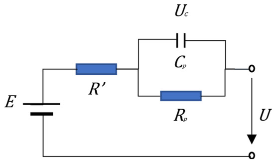 where denotes the battery’s terminal voltage, denotes the battery’s open circuit voltage, denotes the battery’s equivalent capacitance–voltage, denotes the circuit current, and is the equivalent resistance. A schematic diagram of the first-order equivalent model of the battery is shown in Figure 4.