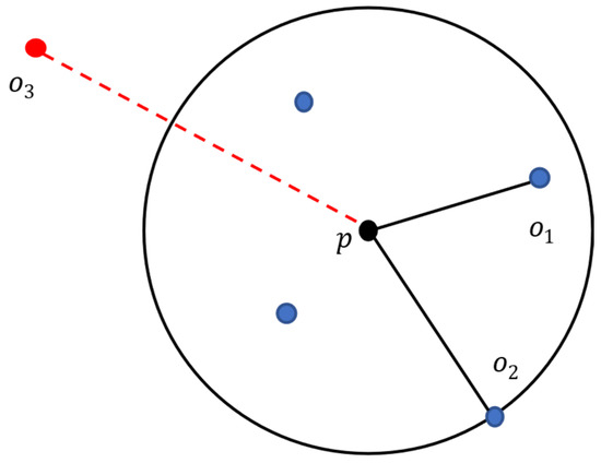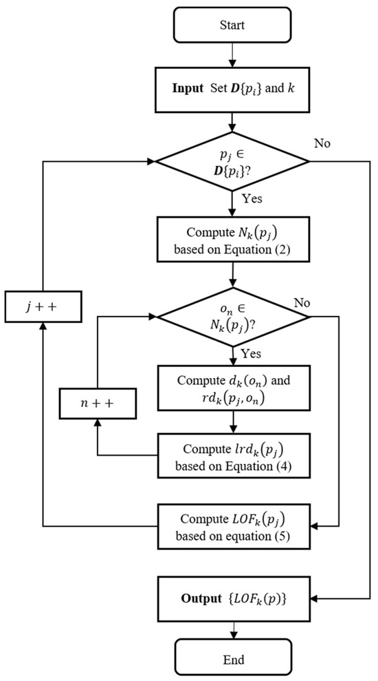 The local reachable density of object is the inverse of the average local reachable distance of the k-nearest neighbors of object . If object has a high degree of outlying, i.e., few near neighbors in its surrounding region, then its k-distance neighborhood has a wide coverage. For an object o within the k-distance neighborhood of , the probability that object is within the k-distance neighborhood of object is small, and has a higher probability of taking . Conversely, if object lies in a cluster of classes, the probability that object is within the k-distance neighborhood of object o is large for object o within the k-distance neighborhood of p, and has a higher probability of taking . Based on the analysis above, it is evident that outlier objects have small local reachable densities, while the local reachable densities of objects in class clusters are close and have larger values. In other words, local reachable densities provide insight into the density of local spatial regions within a dataset.