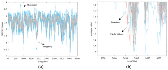 To verify the effectiveness of the method proposed in this paper, we will first analyze how the parameters extracted from different feature indicators distinguish battery failure, using car 2 as an example. A moving window length of 50 is used, and the tolerance in the extended RMSE method is set to 0.5. Figure 10 shows the results of applying the information entropy method to car 2. The blue curves represent the upper and lower limits of the 3σ threshold, while the red curve represents the curve of the faulty battery.